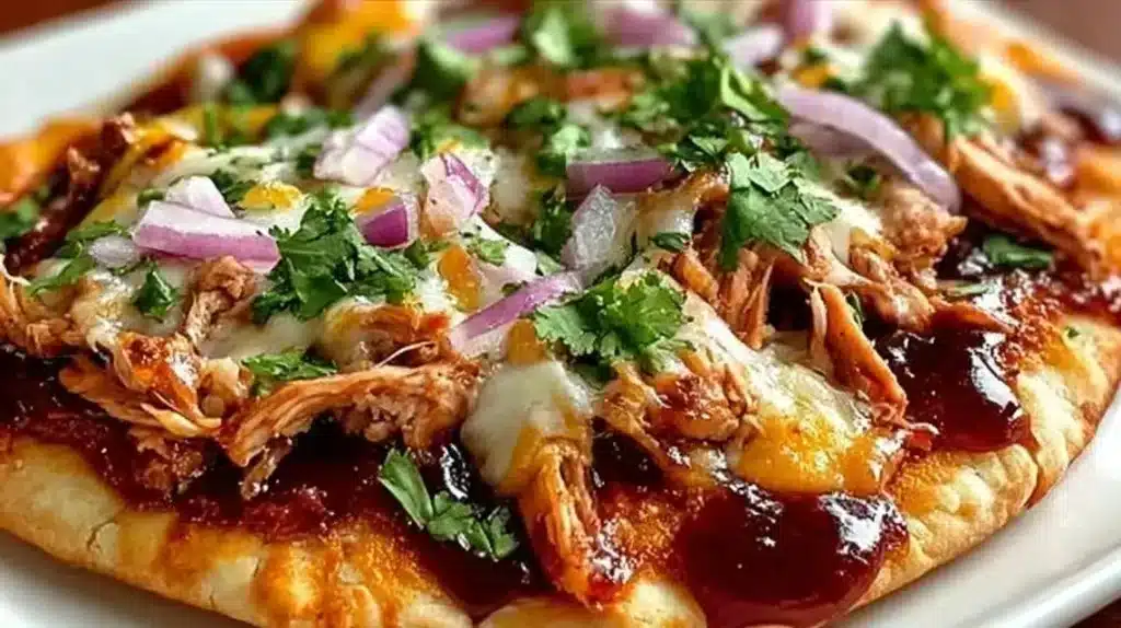 BBQ chicken flatbread takes the idea of pizza and strips it down to a simpler, faster version. A flatbread or naan is used as the crust, brushed or spread with barbecue sauce, layered with cooked shredded chicken, topped with shredded cheese and a few slices of red onion, then baked until the cheese melts and becomes bubbly. The taste is sweet, tangy, and richly savory thanks to the barbecue sauce and cheese, while the texture mixes crispy edges with a soft, pulled-chicken topping. It feels like a casual comfort-food meal — perfect for weeknights, weekend lunches, or low-key get-togethers. The cooking method is short baking in a hot oven, which keeps things quick and hands-off.