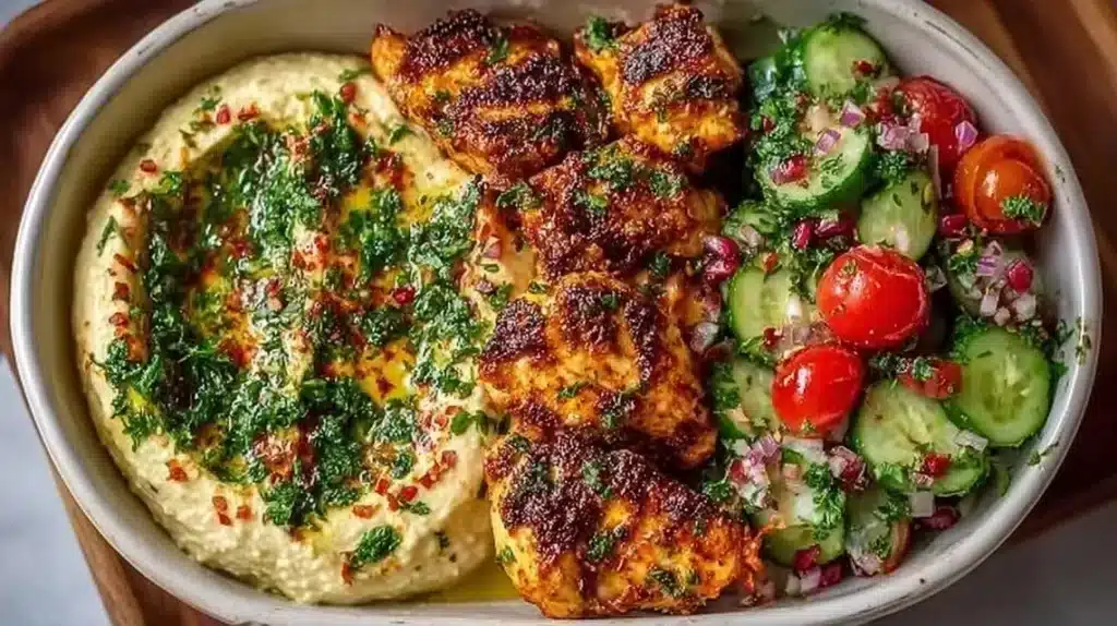 - Balanced textures: crispy seared chicken, smooth hummus, and crunchy cucumber salad.